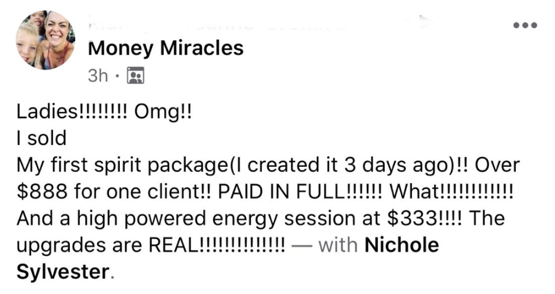 Money Miracles has six LIVE Coaching Sessions with Nichole. These sessions are Q&A style coaching + spiritual activations + channeled lessons based on group needs. Personalized support within the group. The recordings will be available. These calls alone are valued at $1999 (6 x 60 Minutes)