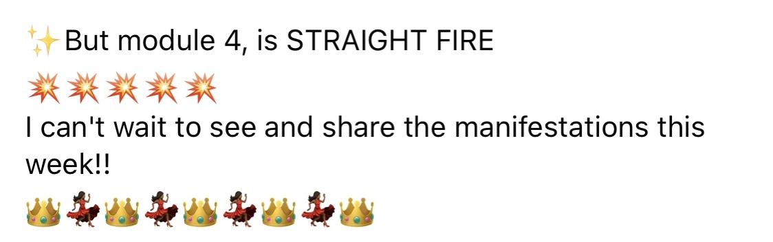 "My decision to do this course has helped me clear out unhealthy/toxic money energetics, tune into my feminine energy, ditch the beliefs that weren't mine, and transform into my Highest self. This course has forever changed the way I view money, myself, and the world around me...don’t hold back, I promise it will be worth every penny."